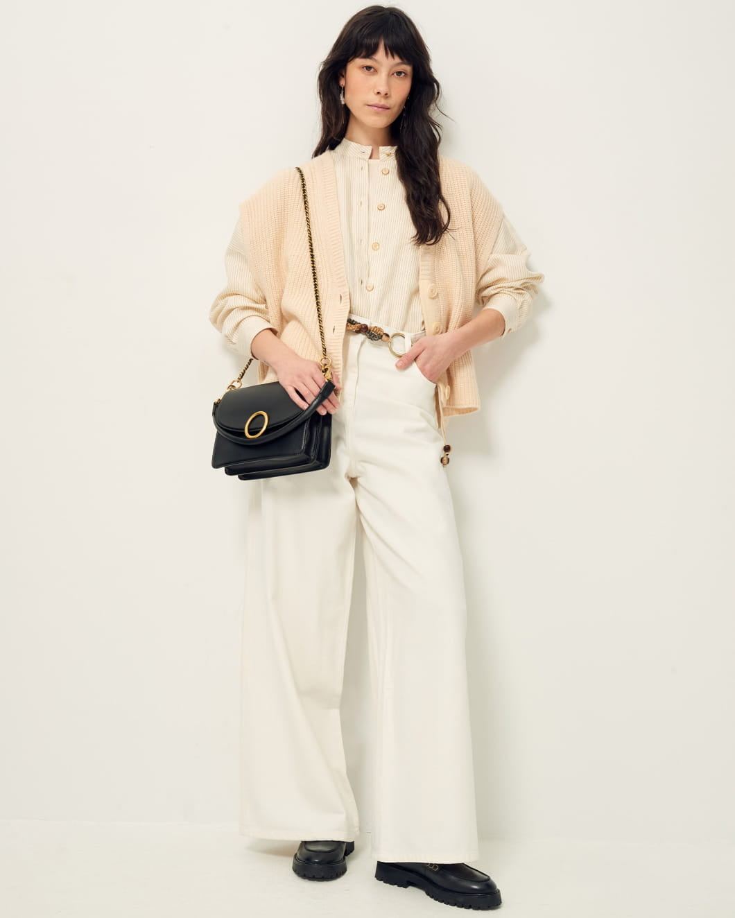 Oversize sleeveless V-neck cardigan in a fluffy large-gauge half-cardigan rib knit. The wool used to make this product has been certified for monitoring and control from rearing to spinning, guaranteeing animal welfare and superior quality.