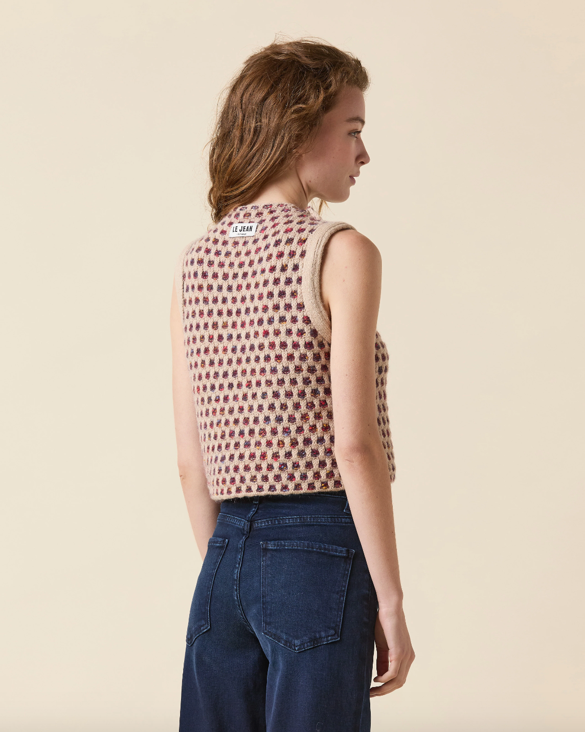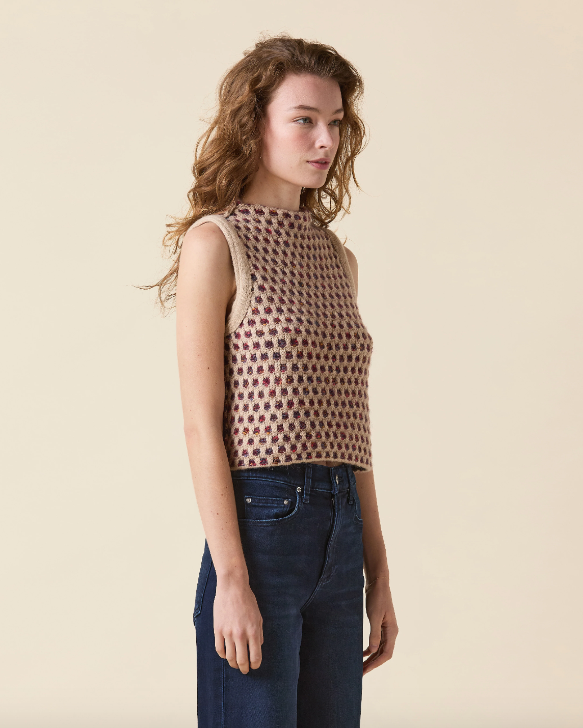 This sleeveless knit features a richly textured check pattern in warm neutral and plum tones, hand-finished for a soft, dimensional feel. The high crew neckline and cropped silhouette make it effortless to layer over crisp shirts or pair solo with high-rise denim.