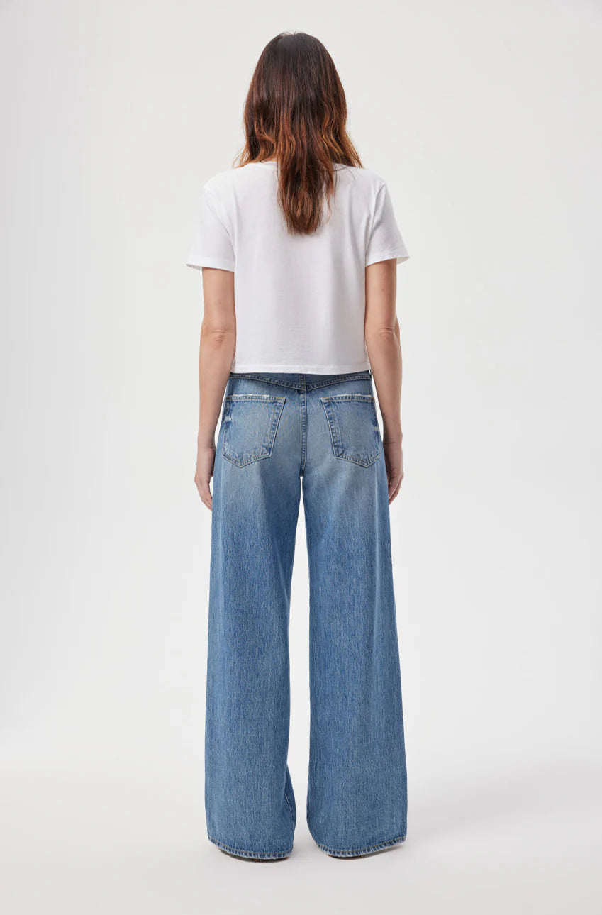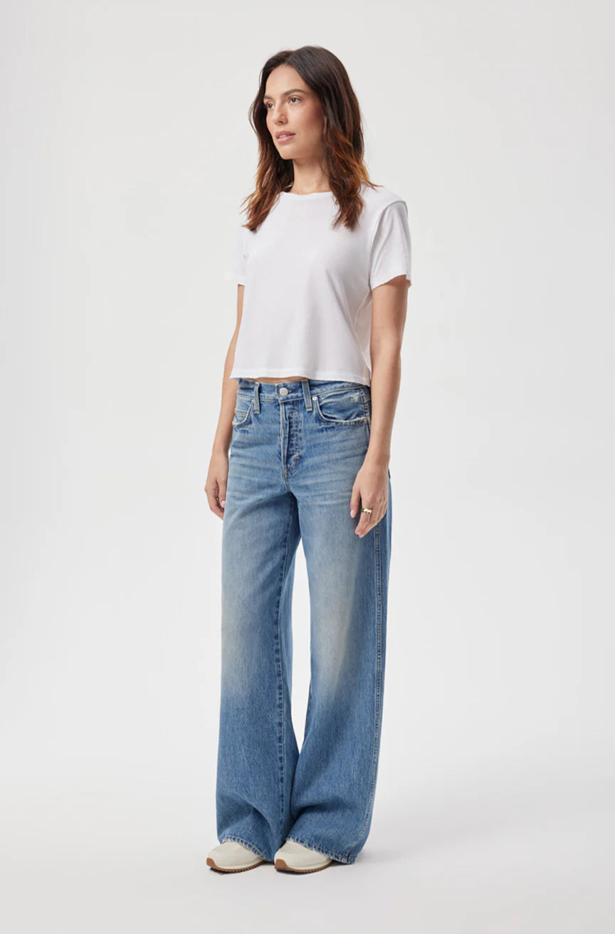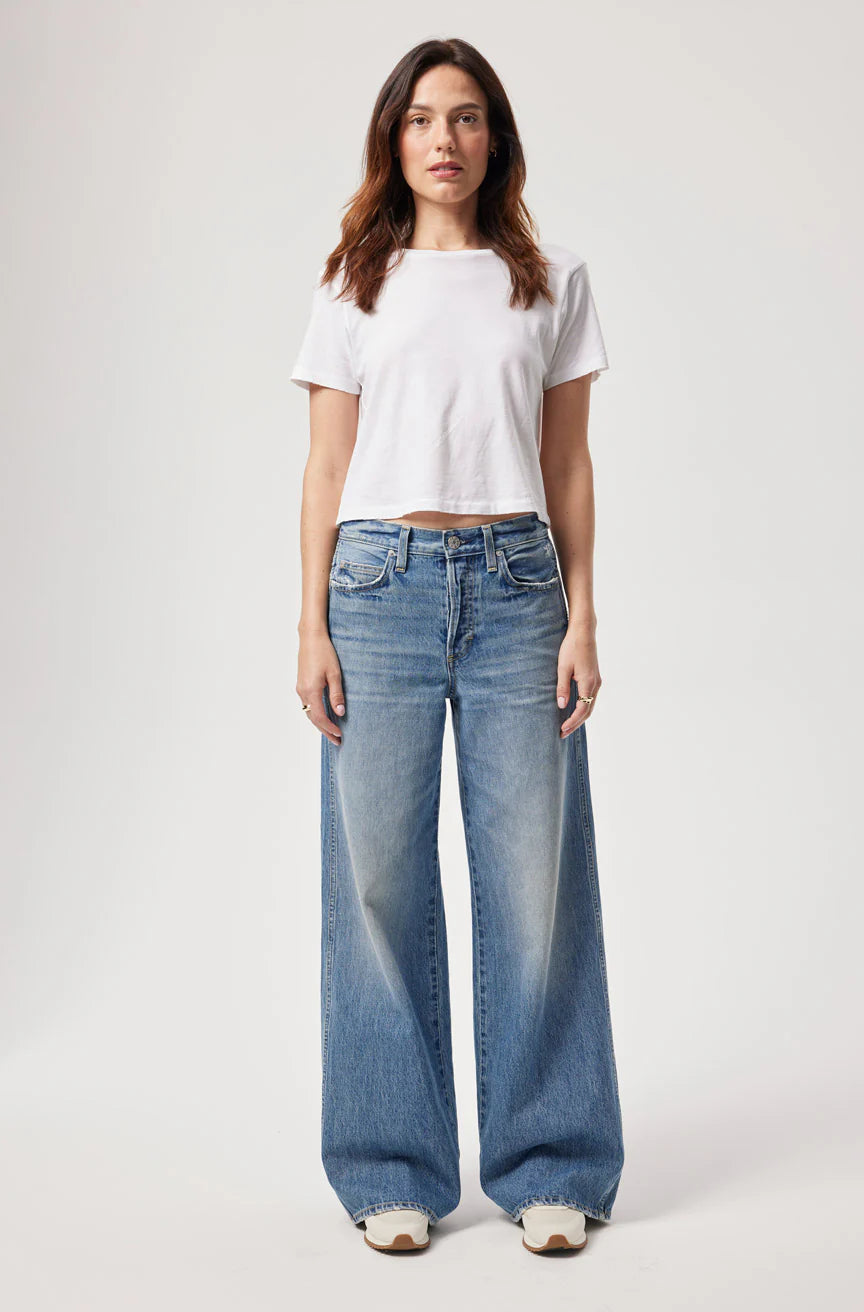 An effortless, mid-rise jean done with just the right amount of ease. The premium rigid denim will fit loose through the hip, thighs, and the wide leg. Finished with fades and a worn in effect with zip fly.