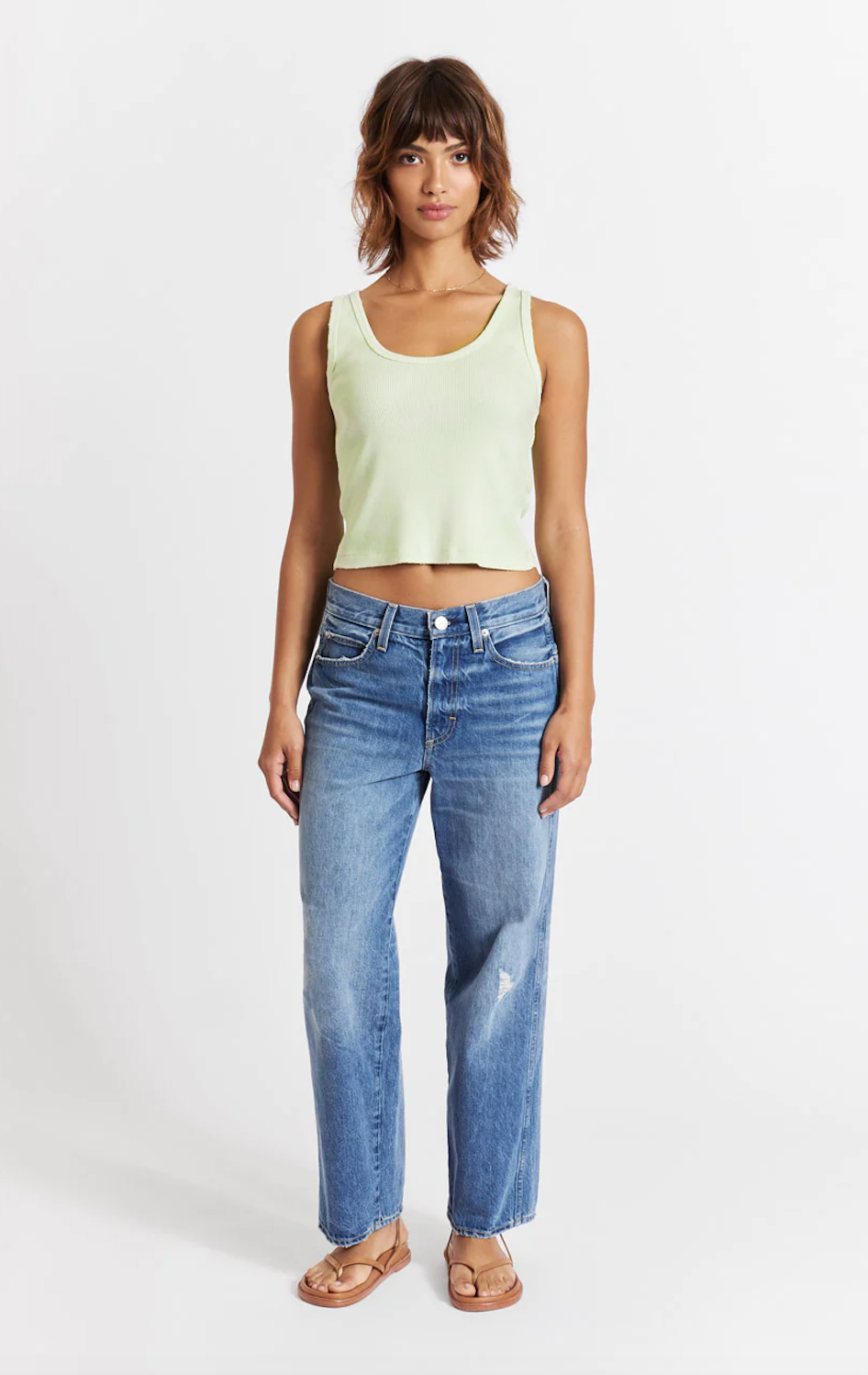 This cropped, wide straight leg is our easiest fit yet. With a mid-rise, this pair is meant to sit low on the hips for a relaxed look. Thoughtful distressing throughout. Zip fly.