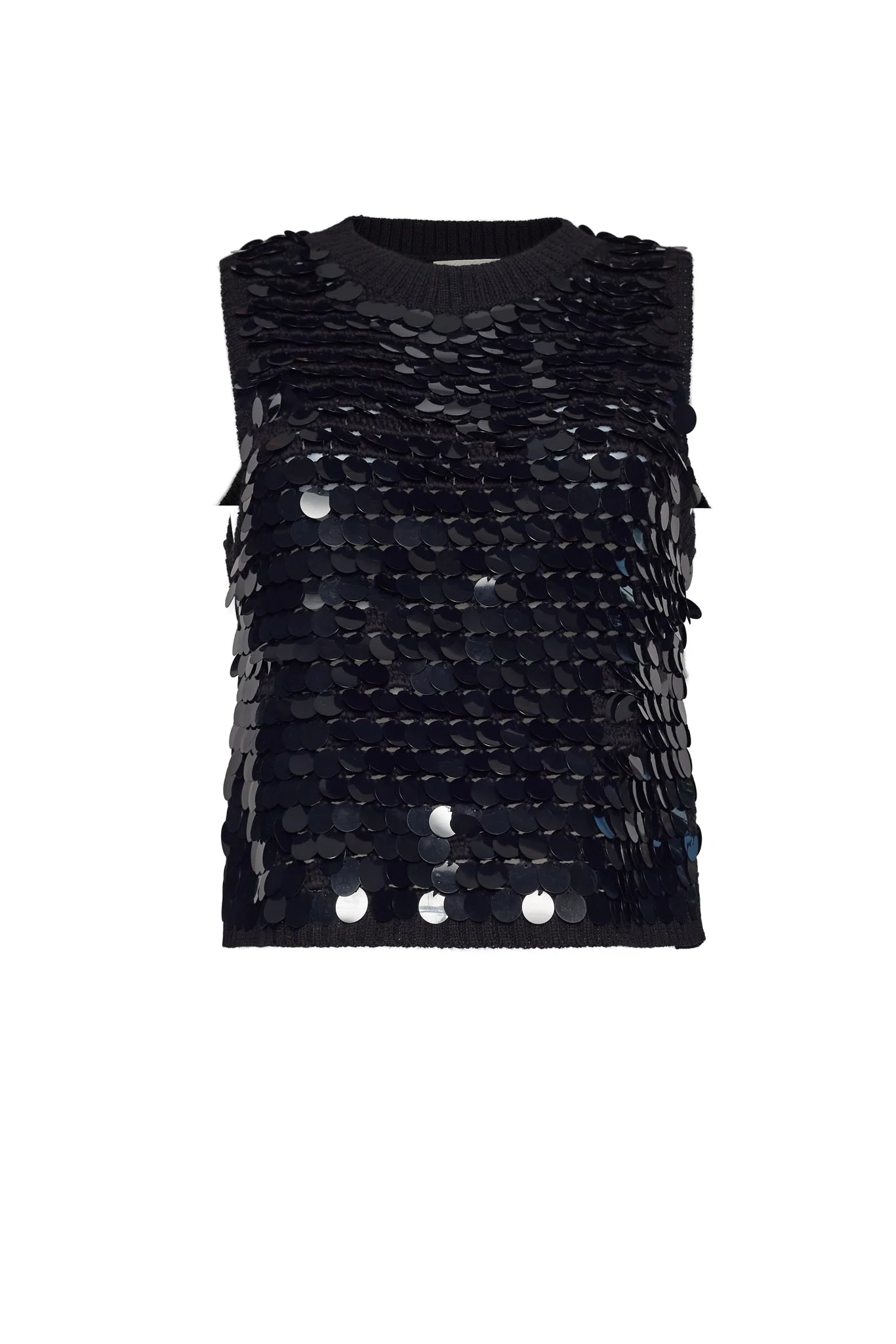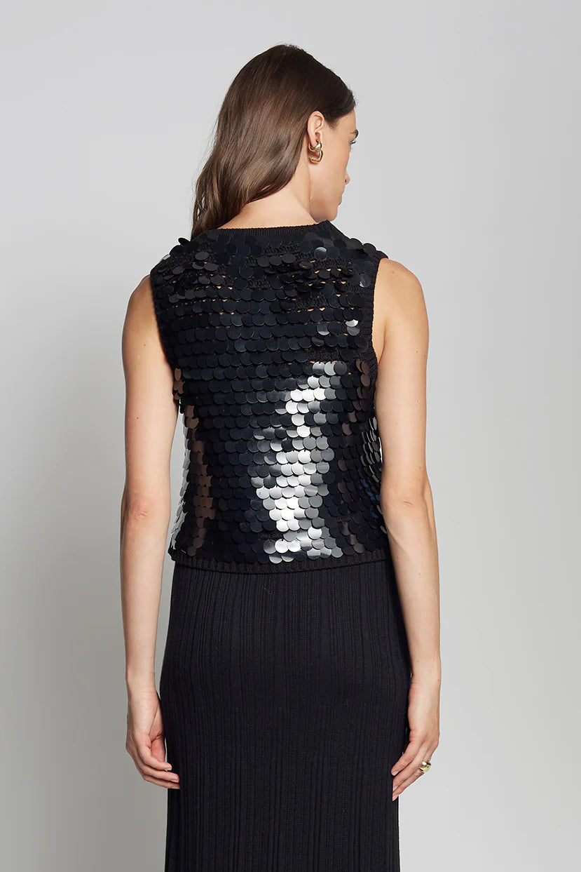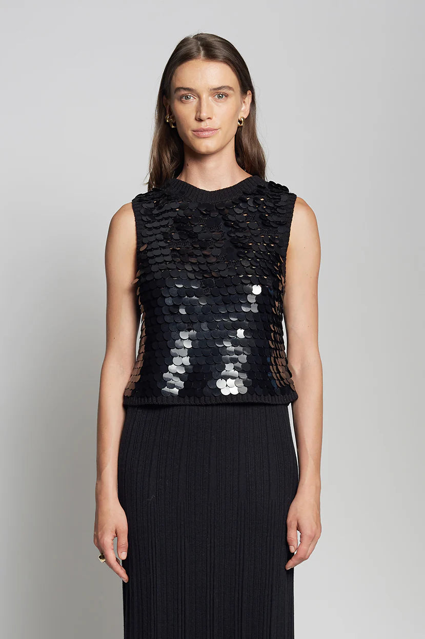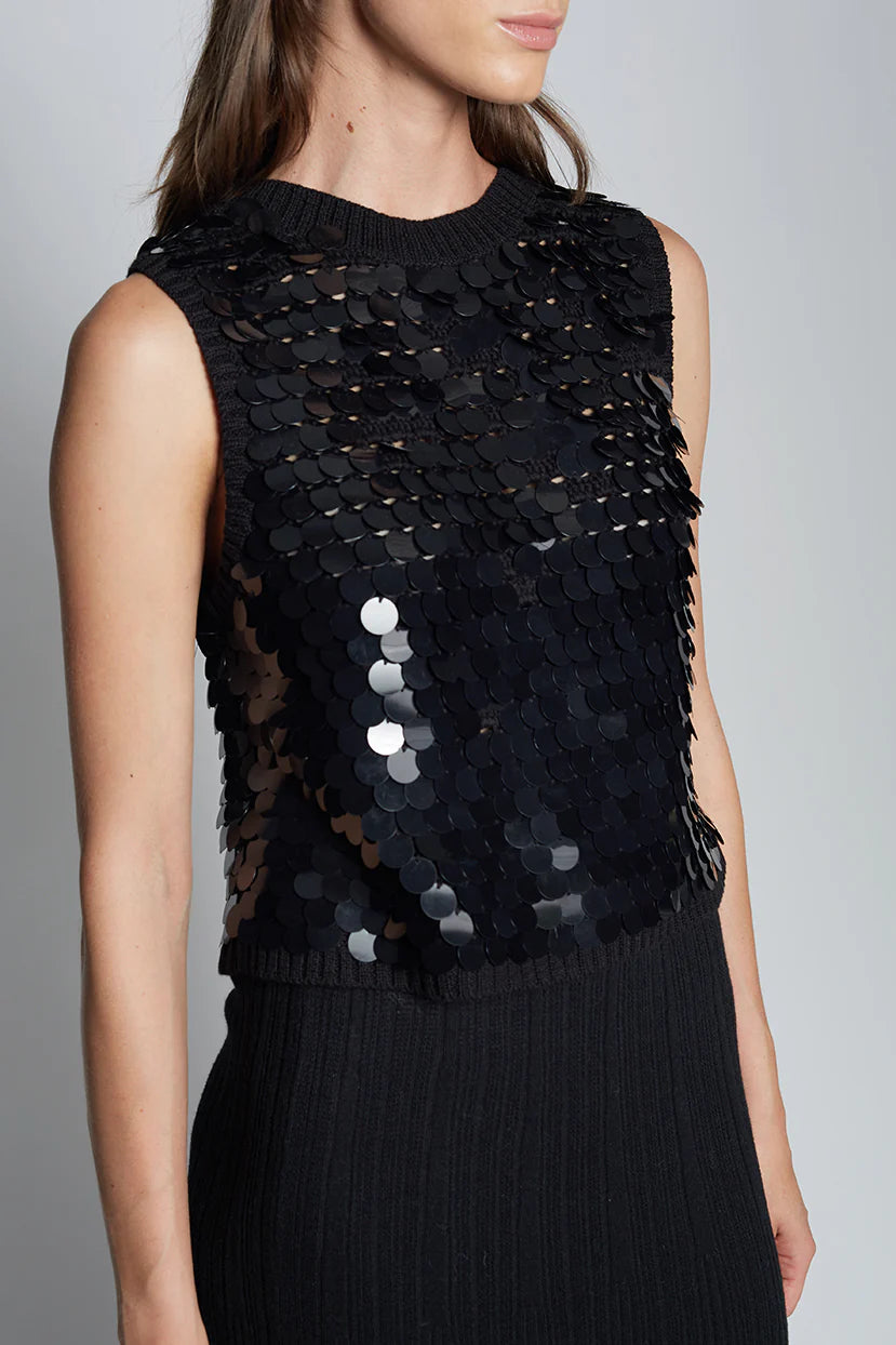 Cora is an elevated crew-neck sweater-tank, back by popular demand from our holiday collection. This sleek, pima cotton tank is made in an open crochet-stitch with large, fun, sequin paillette's applied all over the body.