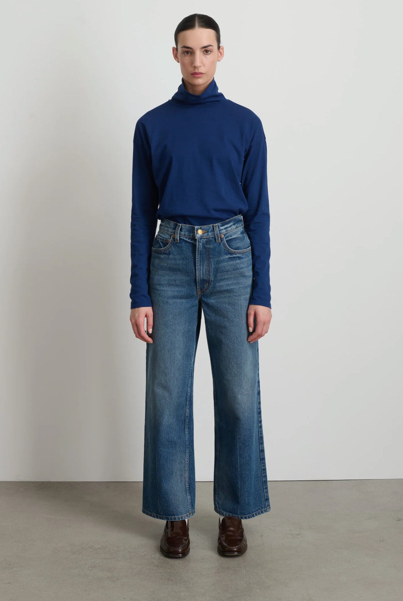 Cut from natural state un-dyed cotton denim, that is lifted to a nostalgic blue hue. Designed to sit at the natural waist and fall into a relaxed wide-leg silhouette.