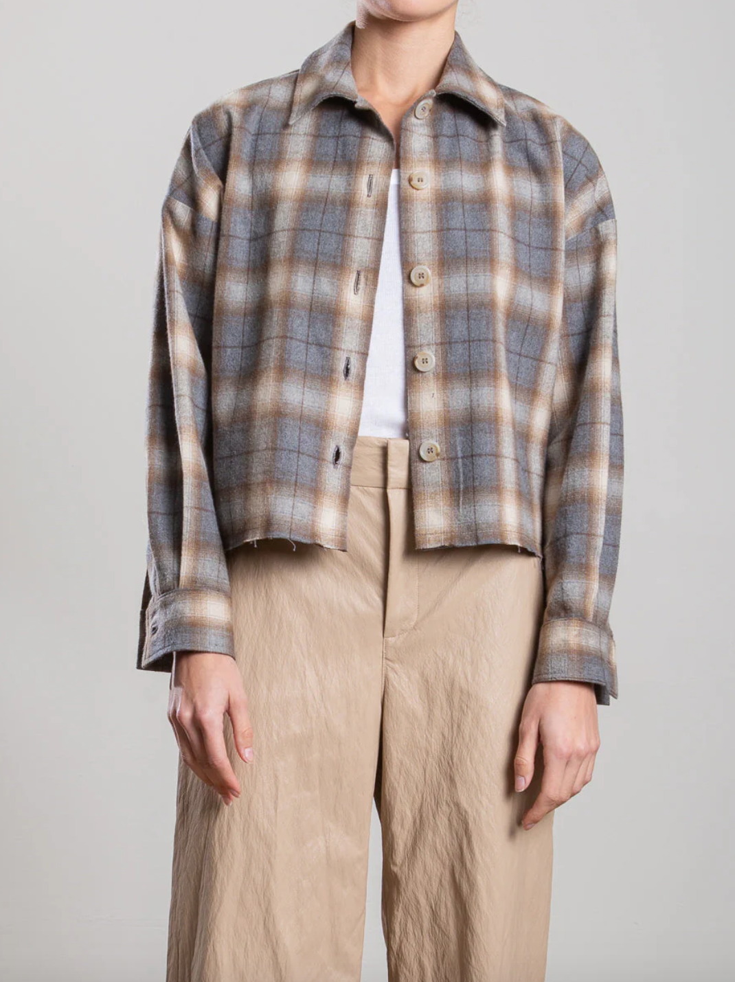A soft, brushed plaid button-down with a relaxed, cropped fit and raw hem. Finished with a button-front closure, long sleeves with button cuffs, and an easy silhouette—perfect for layering and everyday wear.