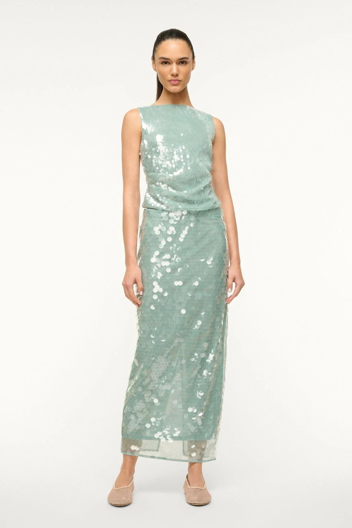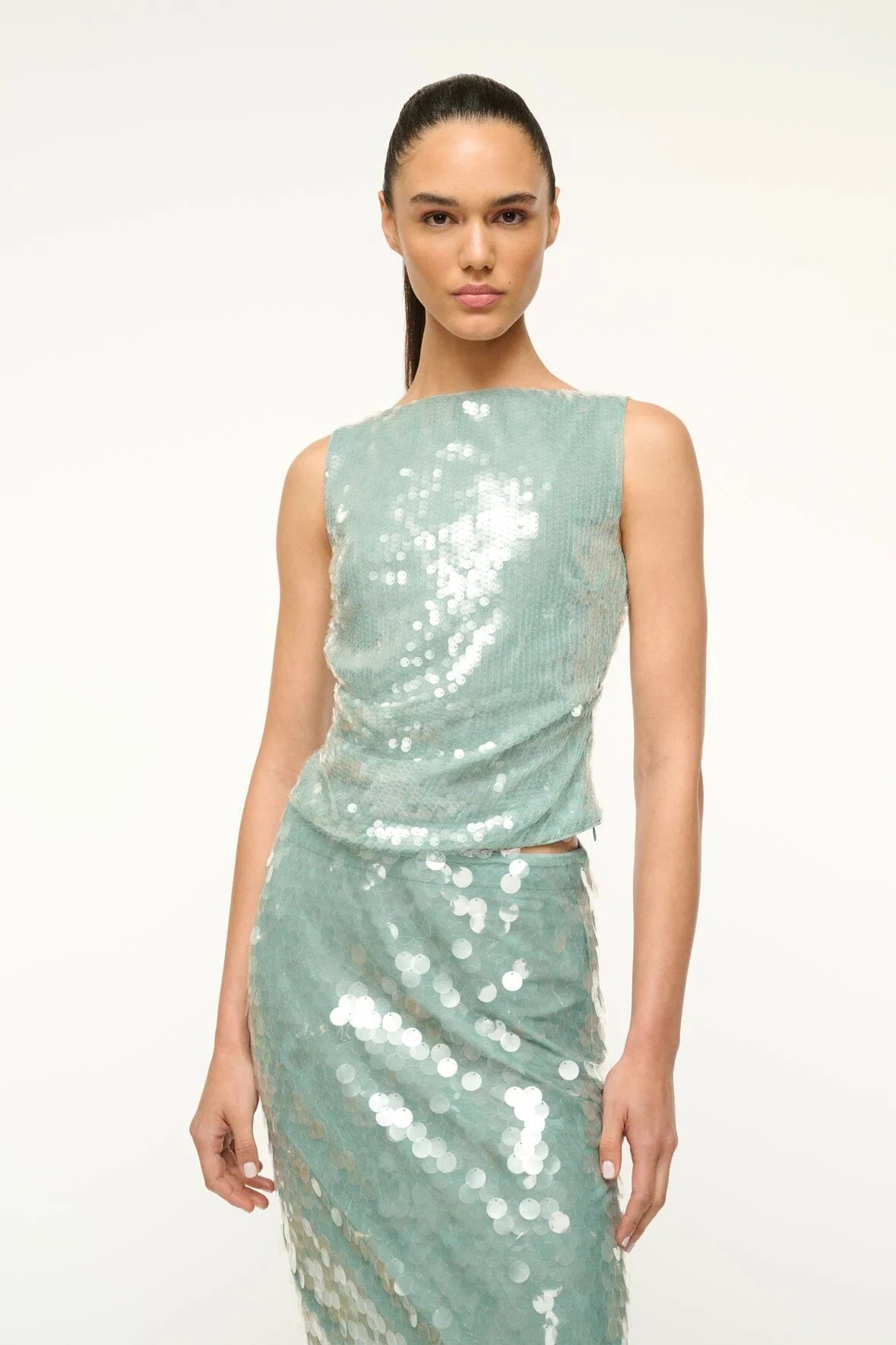 The Eton Top is a boatneck sequined top with asymmetric draping at the waist and a button closure.