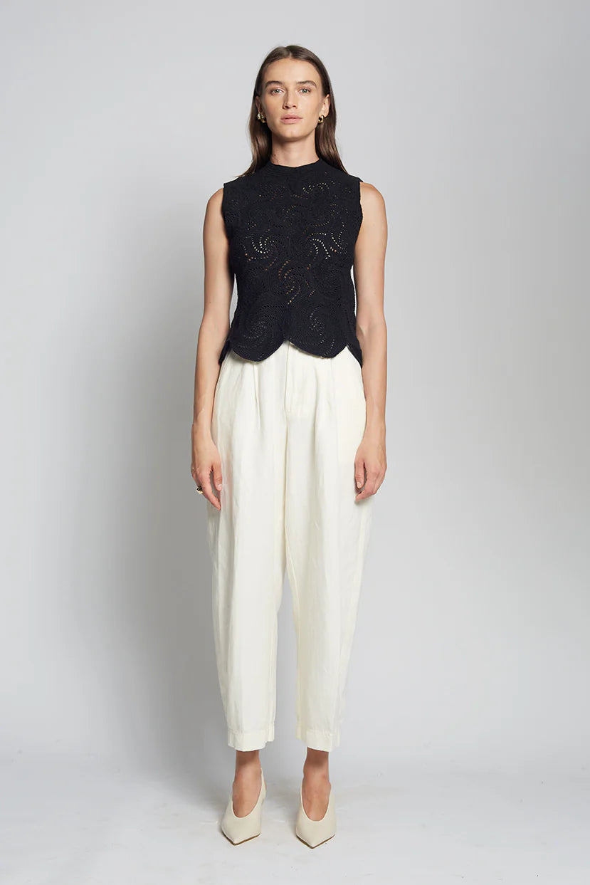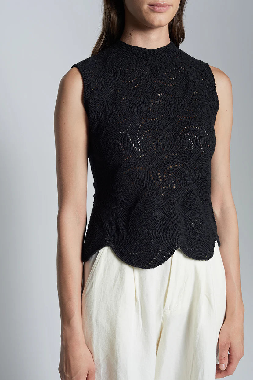 The Evie Crochet tank is a slim-fit silhouette is made with striking circular doilies hand-crochet shapes. The ornate fabrication, mock neck and bold scallop hem make for a dressy feel.