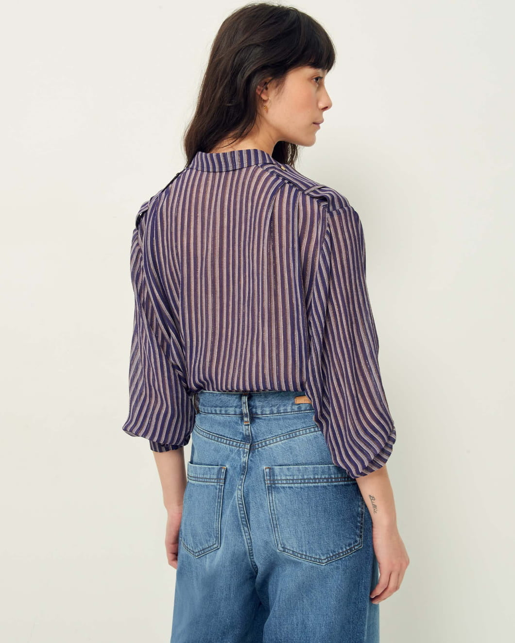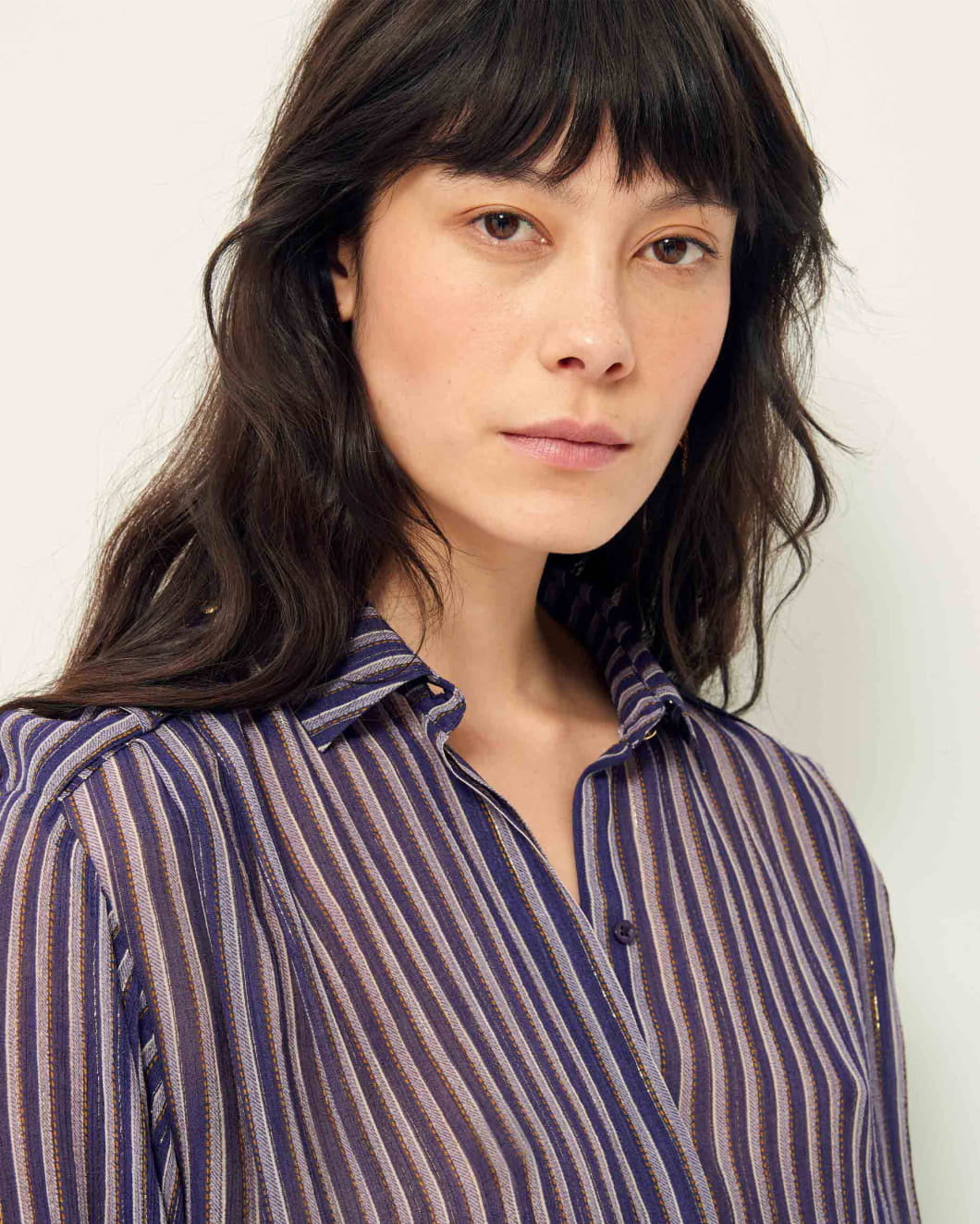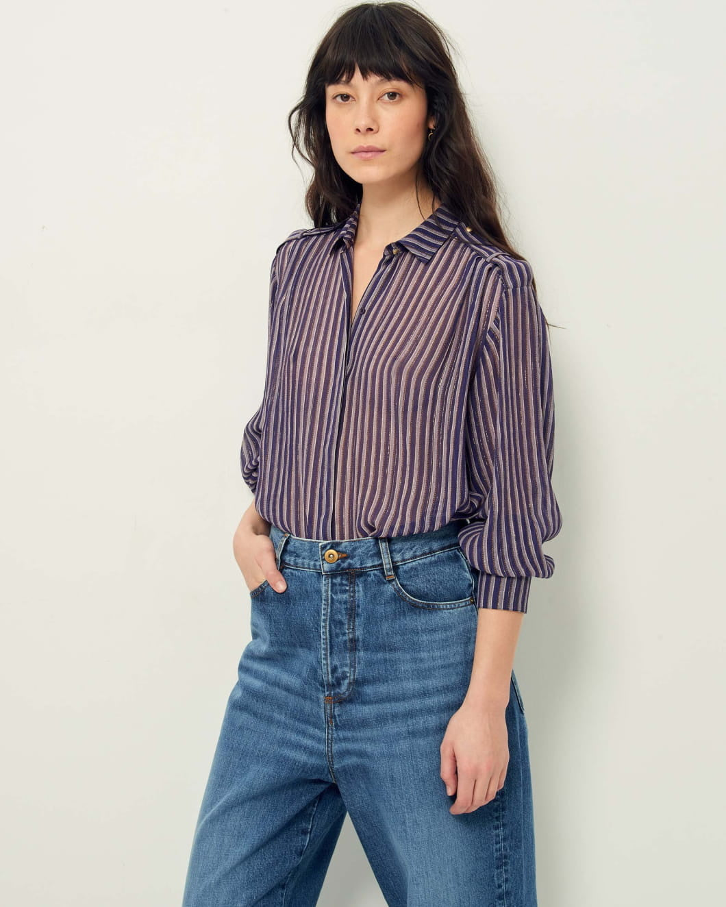 Shirt with button tabs on the shoulders in a striped viscose chiffon crepon print fabric with fine metallic stripes.