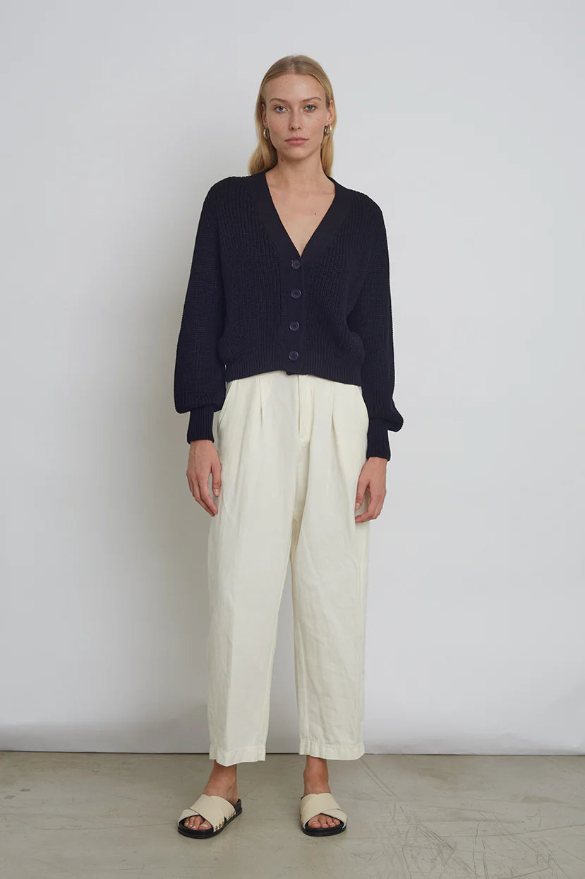 The Isla Cardi is a polished, cotton version with a feminine subtle, blouson-sleeve, a slightly cropped body-proportion and minimal four button closure, you can wear alone or back to your favorite on-the-waist pants or as an open-topper.