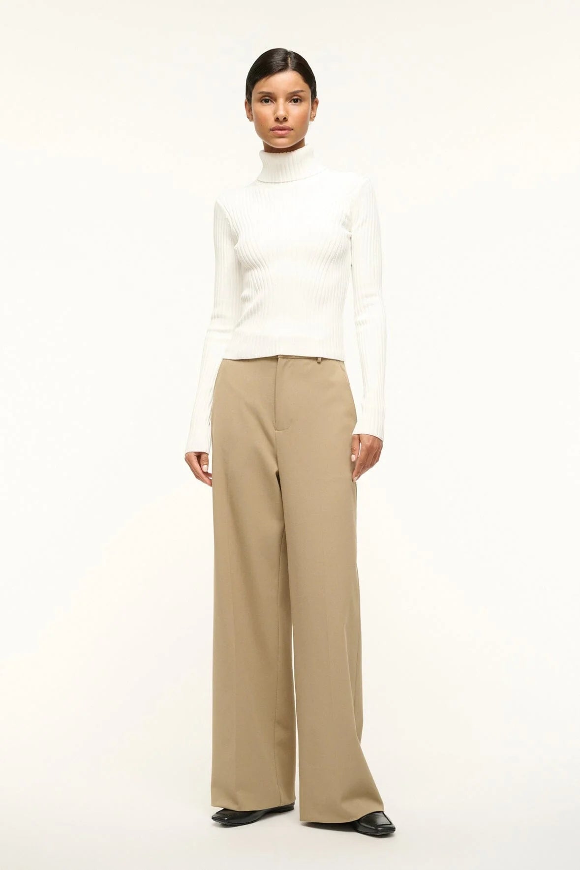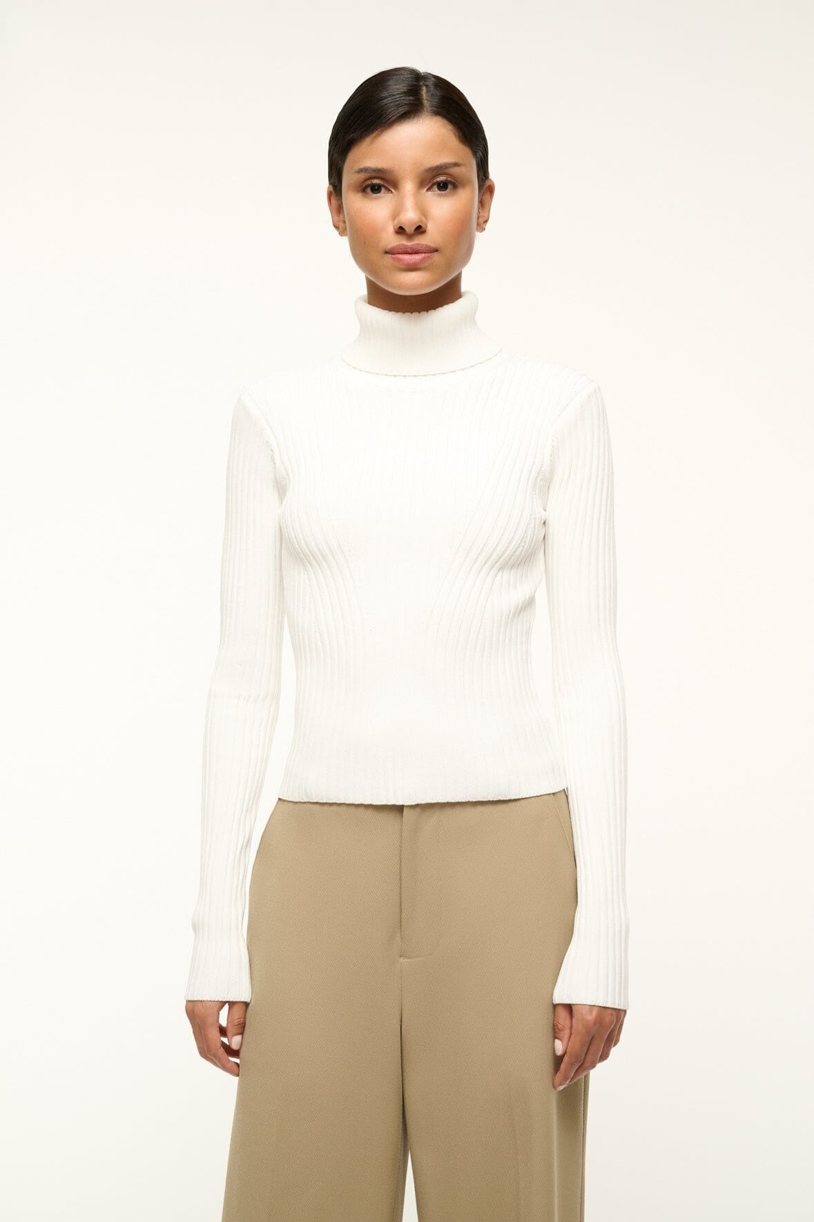 A fitted, long sleeve turtleneck, the Jace Top offers an essential layering piece for any seasonal transition. This style is made out of a rib knit fabric with fully fashioned directional pattern.