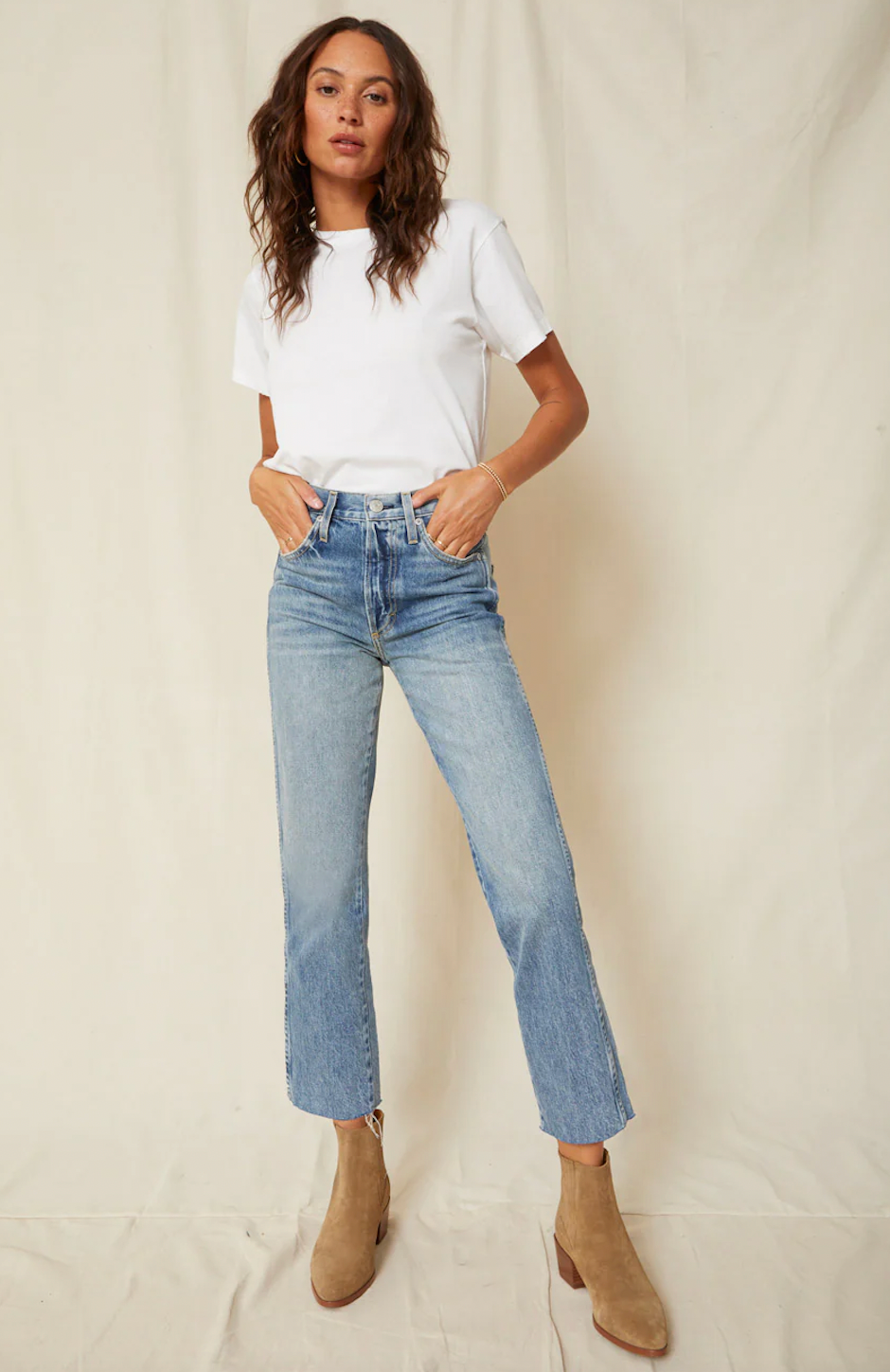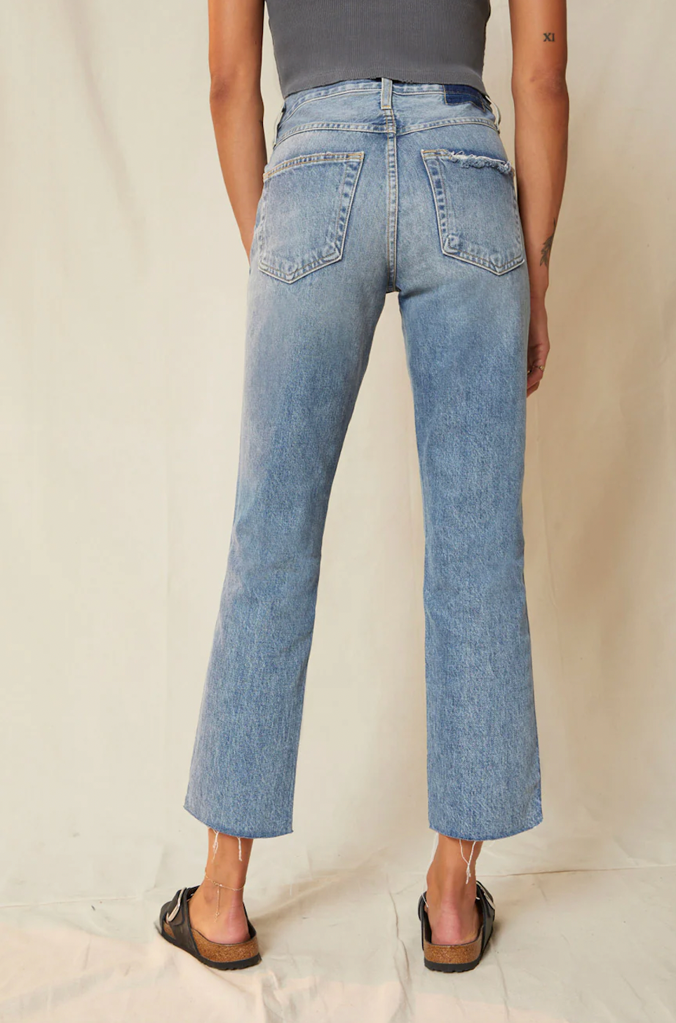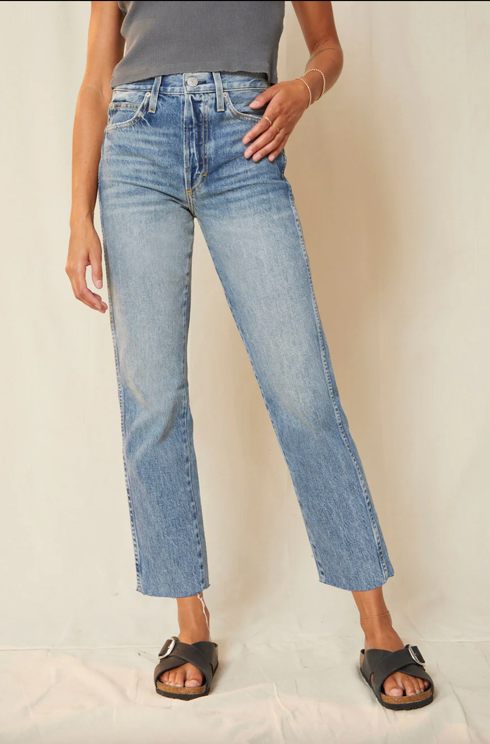 The LOVERBOY has a slightly relaxed fit, with a high-rise & straight leg. Hem is frayed and cropped above the ankle. Features button fly with 5-pocket styling.