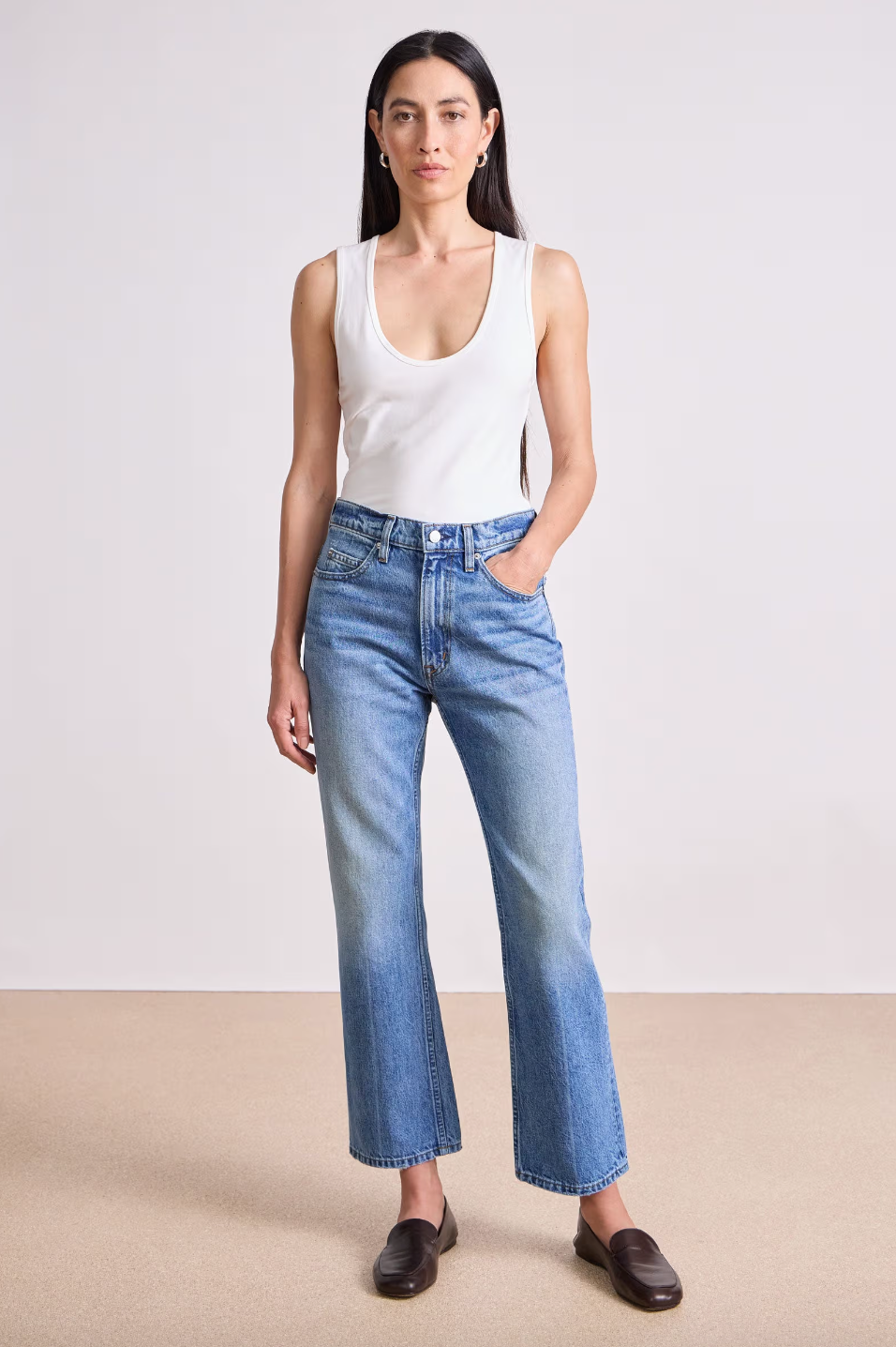 - Mid rise, ankle length, cropped kick flare, belt loops