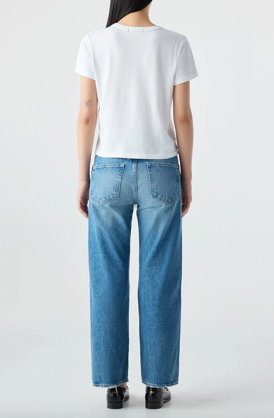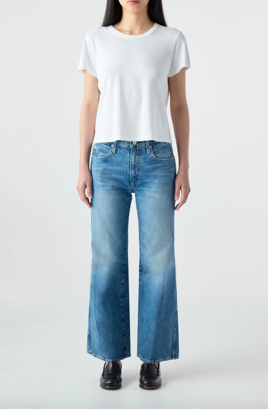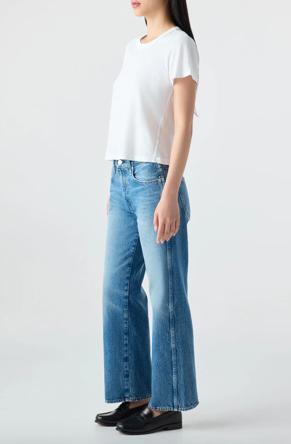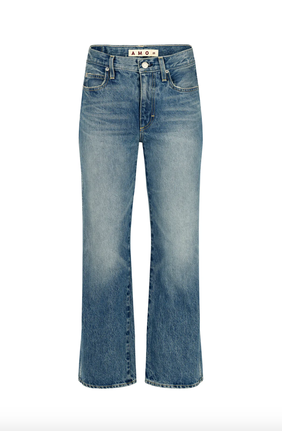 Mid rise with a relaxed fit through the hip, this jean features a subtle, easy flare and a cropped length for that effortless look. Zip fly