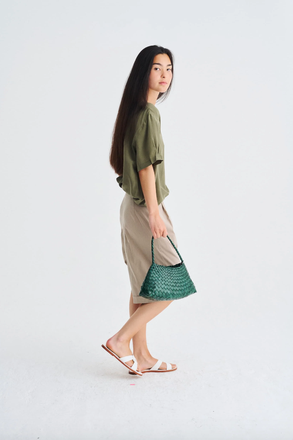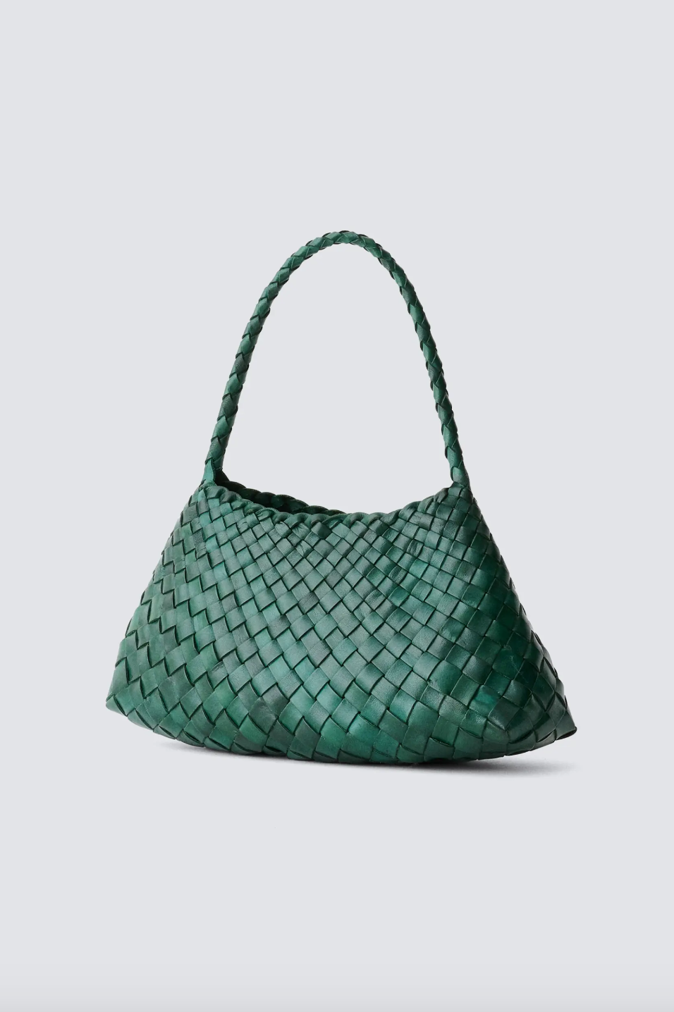 Rosanna is a woven leather baguette bag that effortlessly combines style and practicality. Its unique silhouette offers versatility, allowing you to effortlessly drape it over your shoulder for easy carrying.