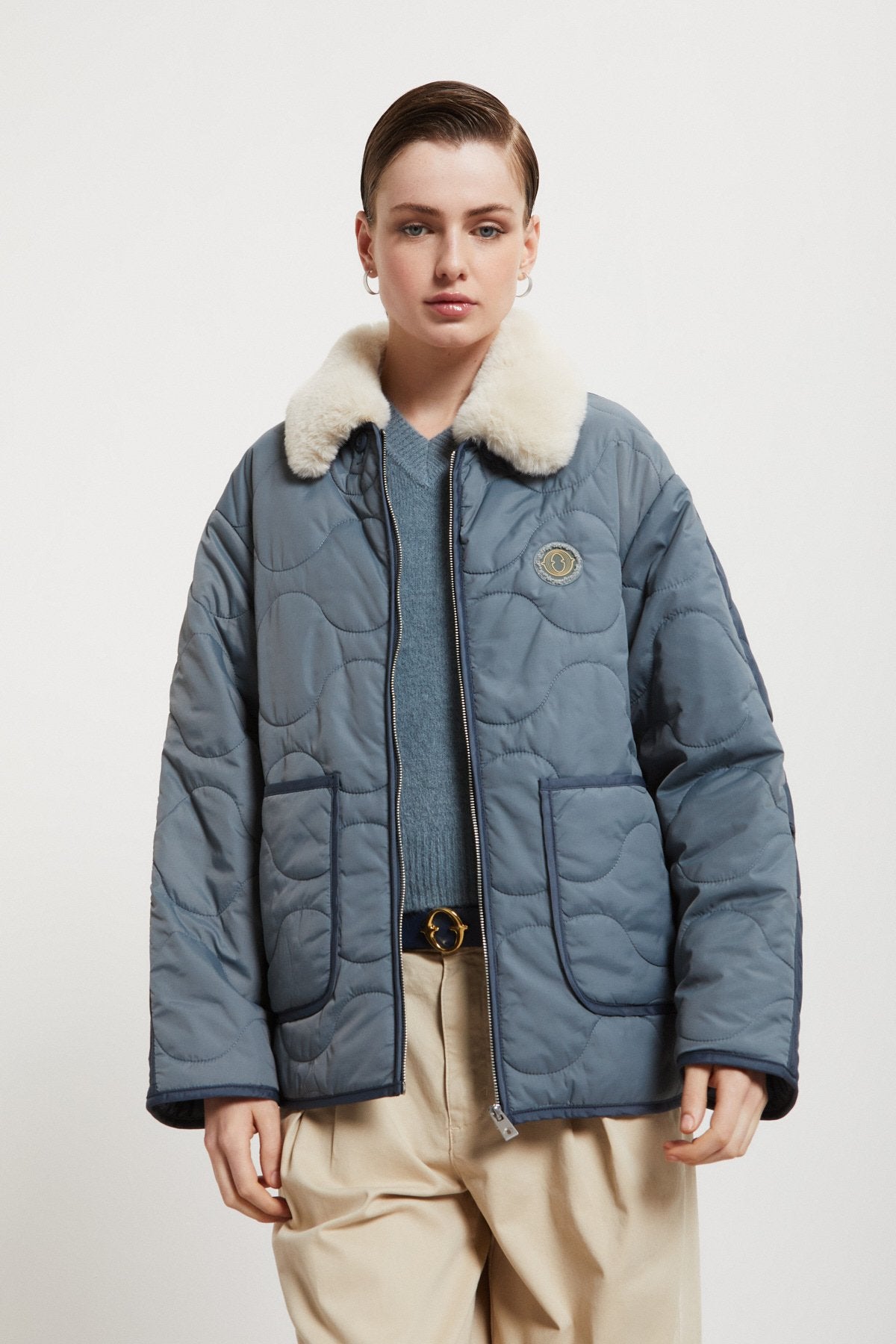 Short quilted down jacket with stitching, hood, applied pockets, zipper, and removable collar.