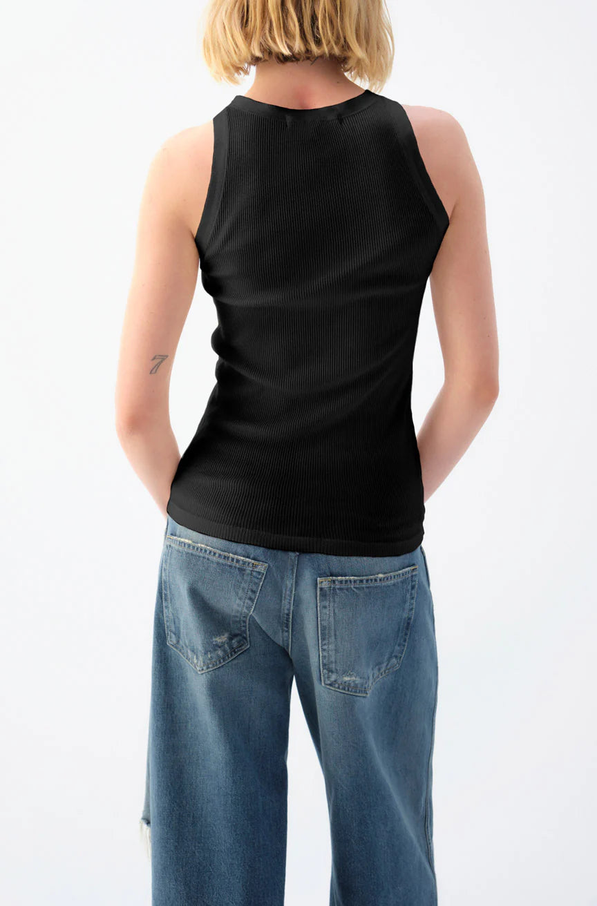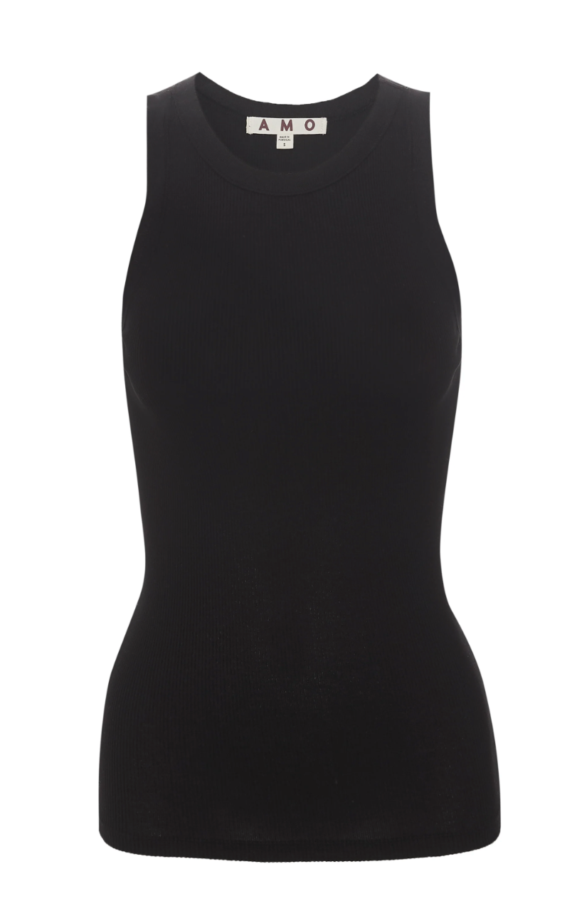A fitted ribbed racerback tank with a high neckline and cutaway armholes. Crafted in silky cotton for all day wearability, it's intended to be worn alone or styled as a layering piece throughout the year.