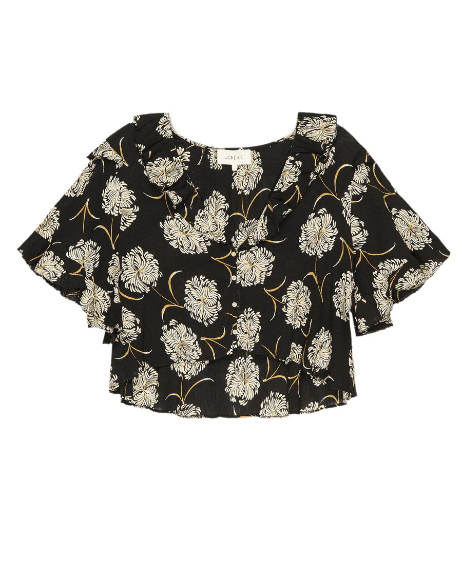 The Bower Top is designed with an easy, relaxed fit and a deep, open neckline for a laid-back feel. Circle-cut ruffles trim the neckline and sleeves, adding soft movement, while lantern-shaped sleeves and a swingy hemline bring a sense of flow.