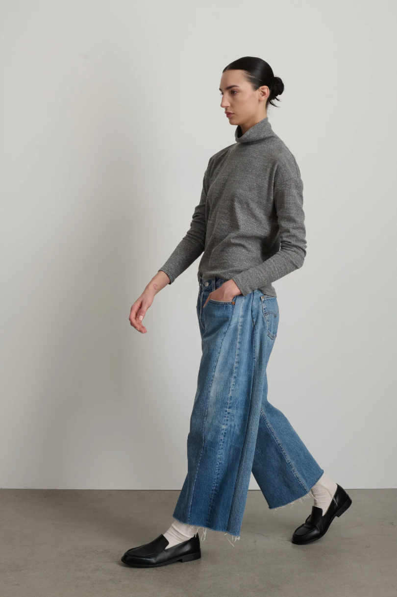 A minimal and essential layering piece for the season, our fine cotton jersey t-neck with dropped sleeve and side slit details. Tall neckline and long lean sleeves accentuate the slightly shrunken silhouette.